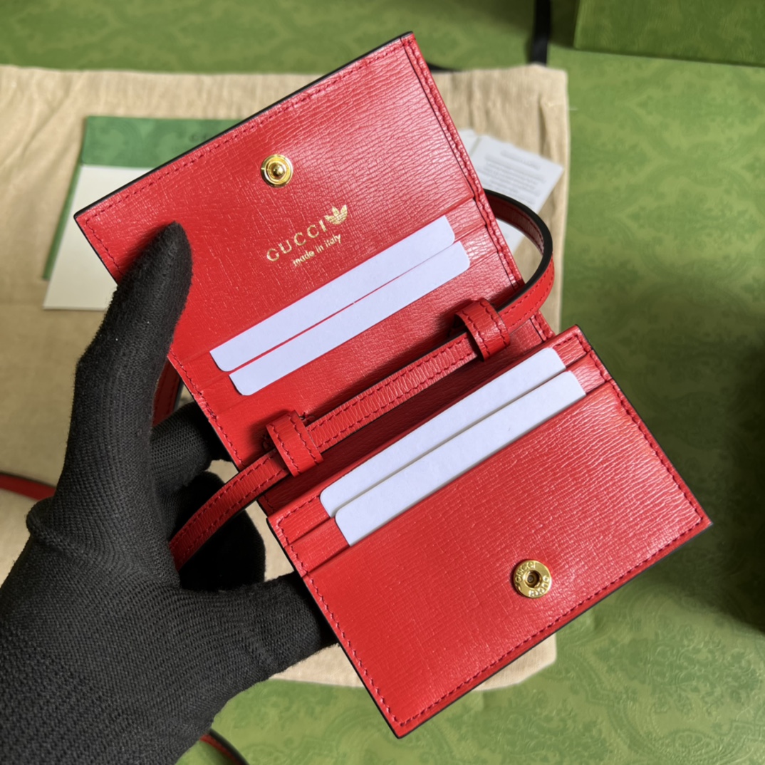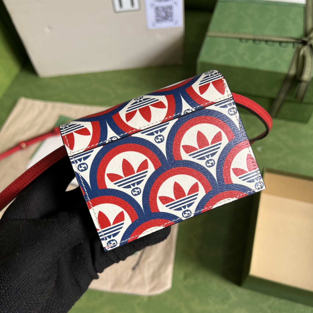 • Part of the adidas x Gucci collection, this card case features the Trefoil print. Emblematic House??s motifs mix with those of the historic sportswear brand adidas. The collection sees both heritages encoded in a trio of lines, where adidas and Gucci combine archival emblems. Creative Director, Alessandro Michele pulls inspiration from his memories of the ??80s and ??90s for a collection that is both nostalgia-driven and contemporary.