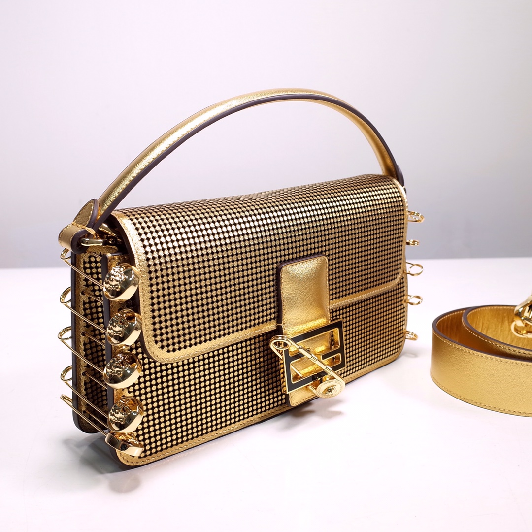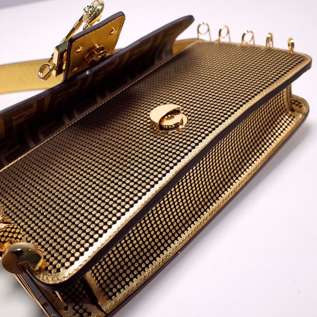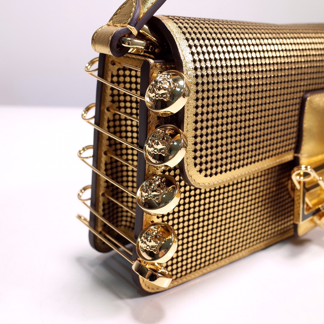 • Iconic, boxy Baguette bag from the Versace by Fendi collection. Made of laser-perforated gold-colored leather that creates an effect that evokes the Versace metal mesh, embellished with five Medusa safety pin brooches on each side. FF closure embellished with a brooch.