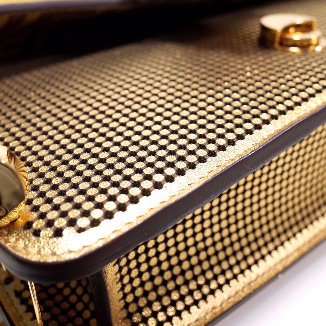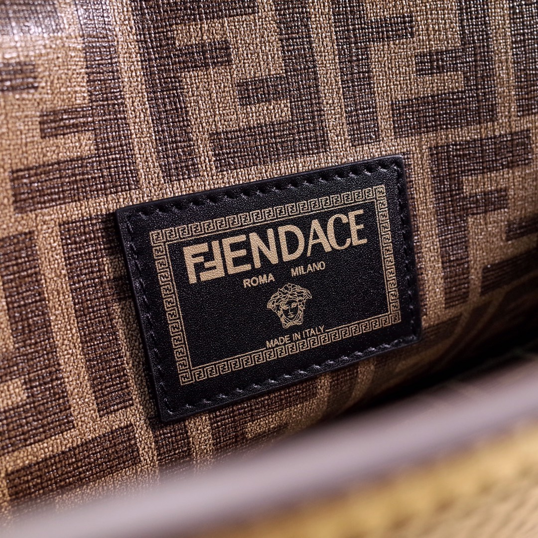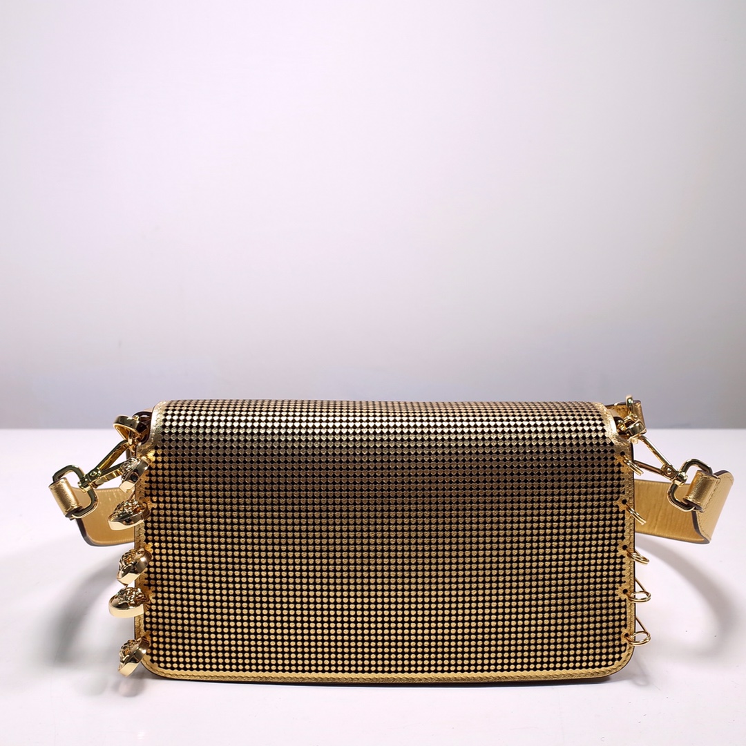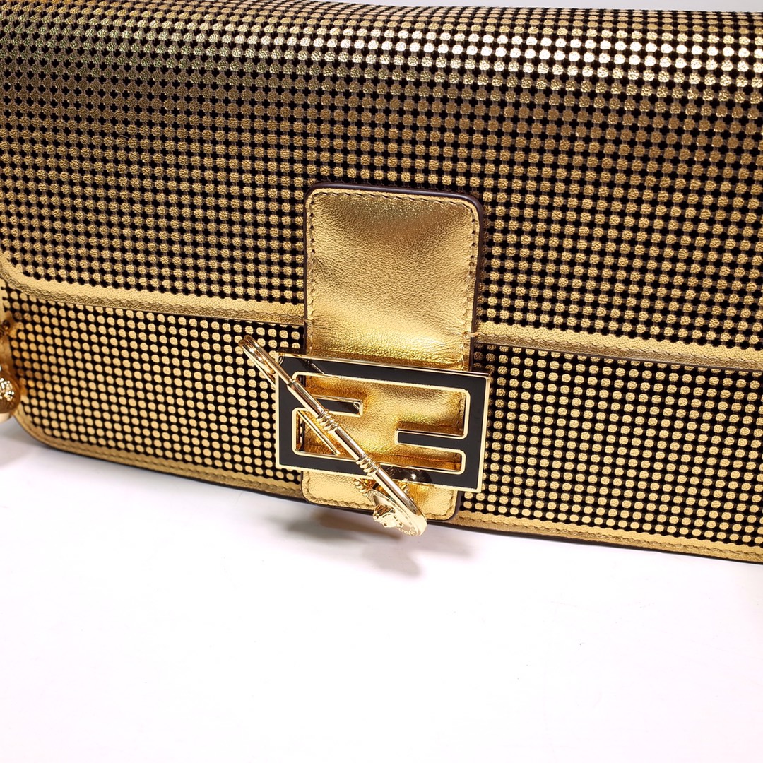• Iconic, boxy Baguette bag from the Versace by Fendi collection. Made of laser-perforated gold-colored leather that creates an effect that evokes the Versace metal mesh, embellished with five Medusa safety pin brooches on each side. FF closure embellished with a brooch.