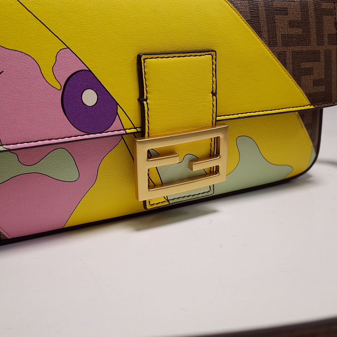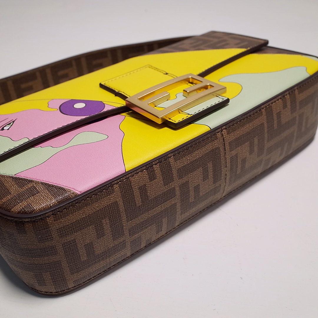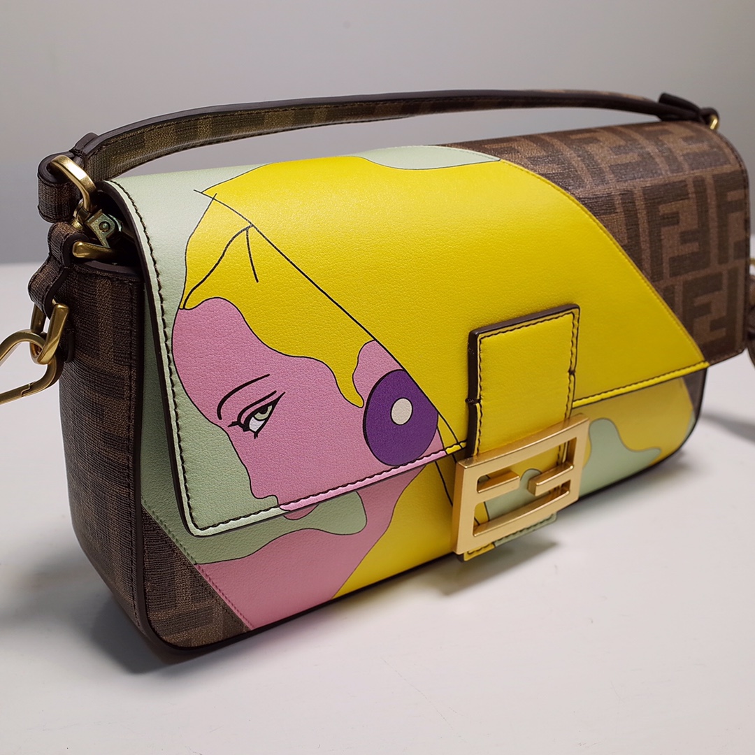 • Iconic medium Baguette bag made from a glazed fabric with an FF motif, printed and multicolor leather hand inlay. Embellished with an FF clasp.