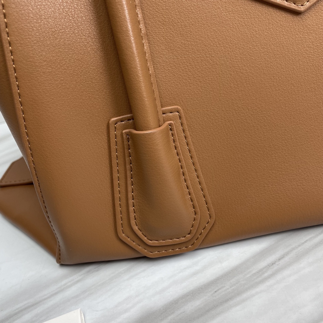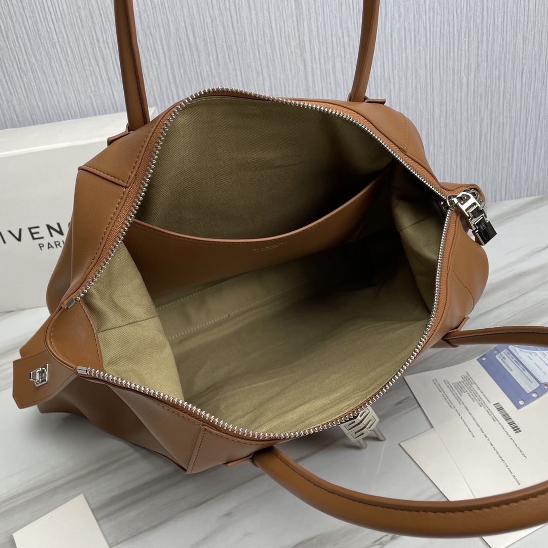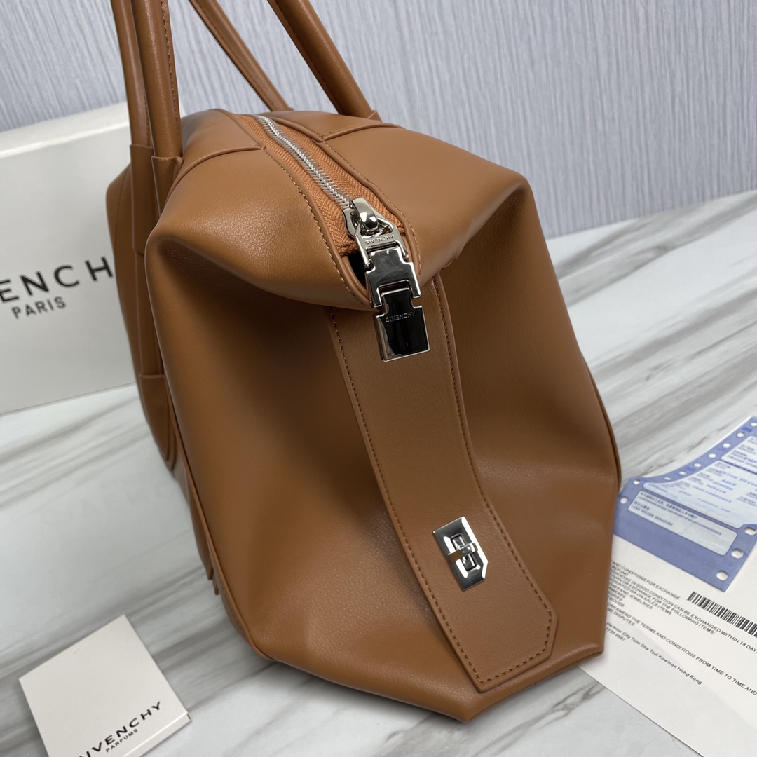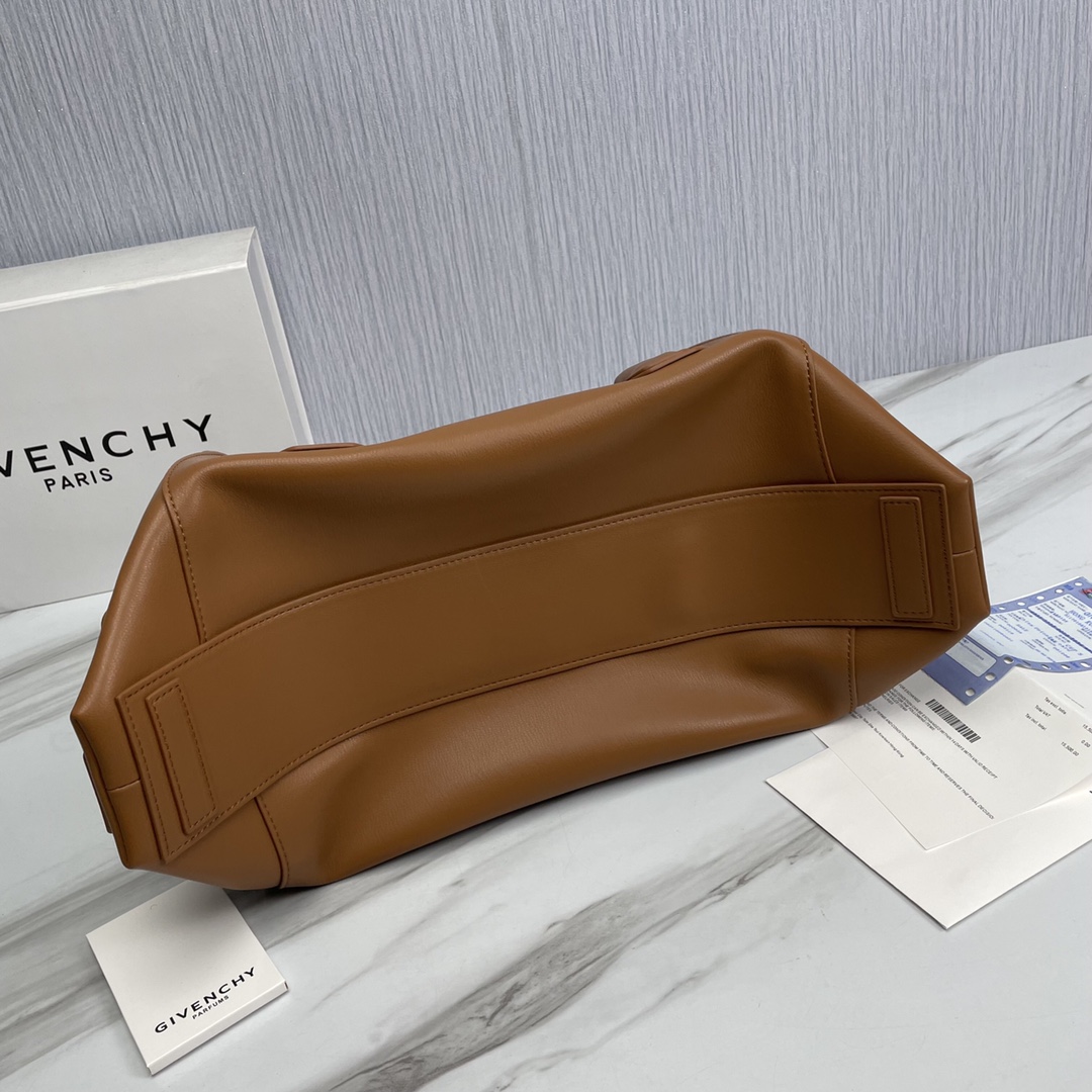 • Medium Antigona Soft bag in soft brown leather, with triangular GIVENCHY patch, dark silver-finish metal details and leather side bands with a twist clasp.