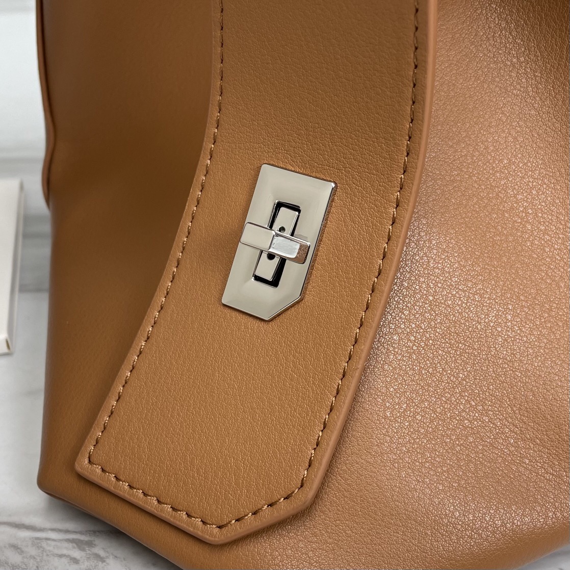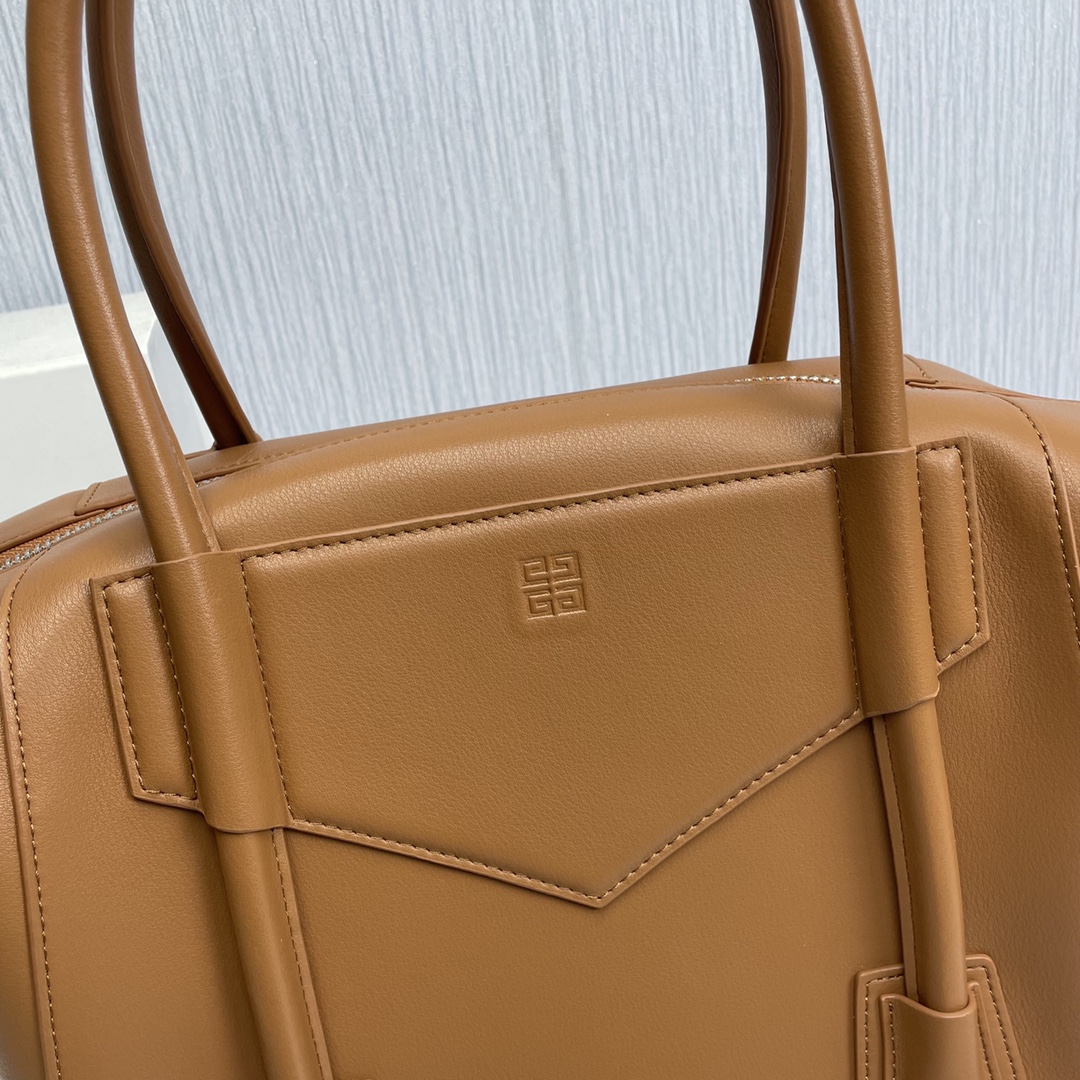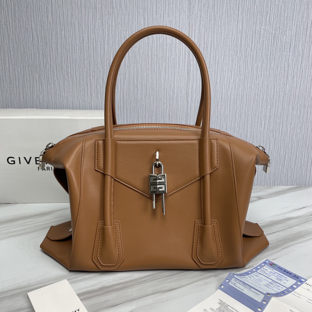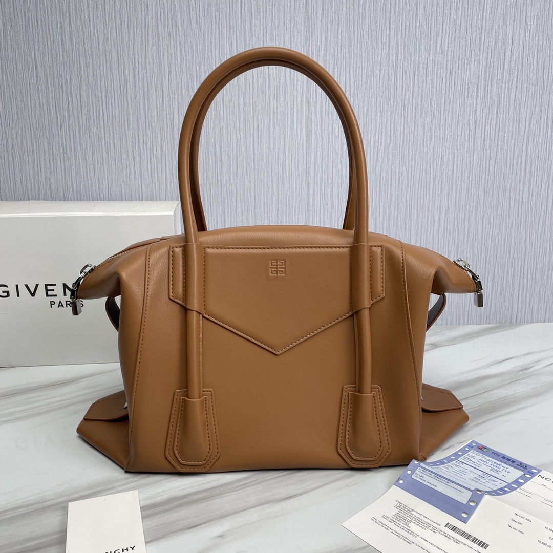 • Medium Antigona Soft bag in soft brown leather, with triangular GIVENCHY patch, dark silver-finish metal details and leather side bands with a twist clasp.