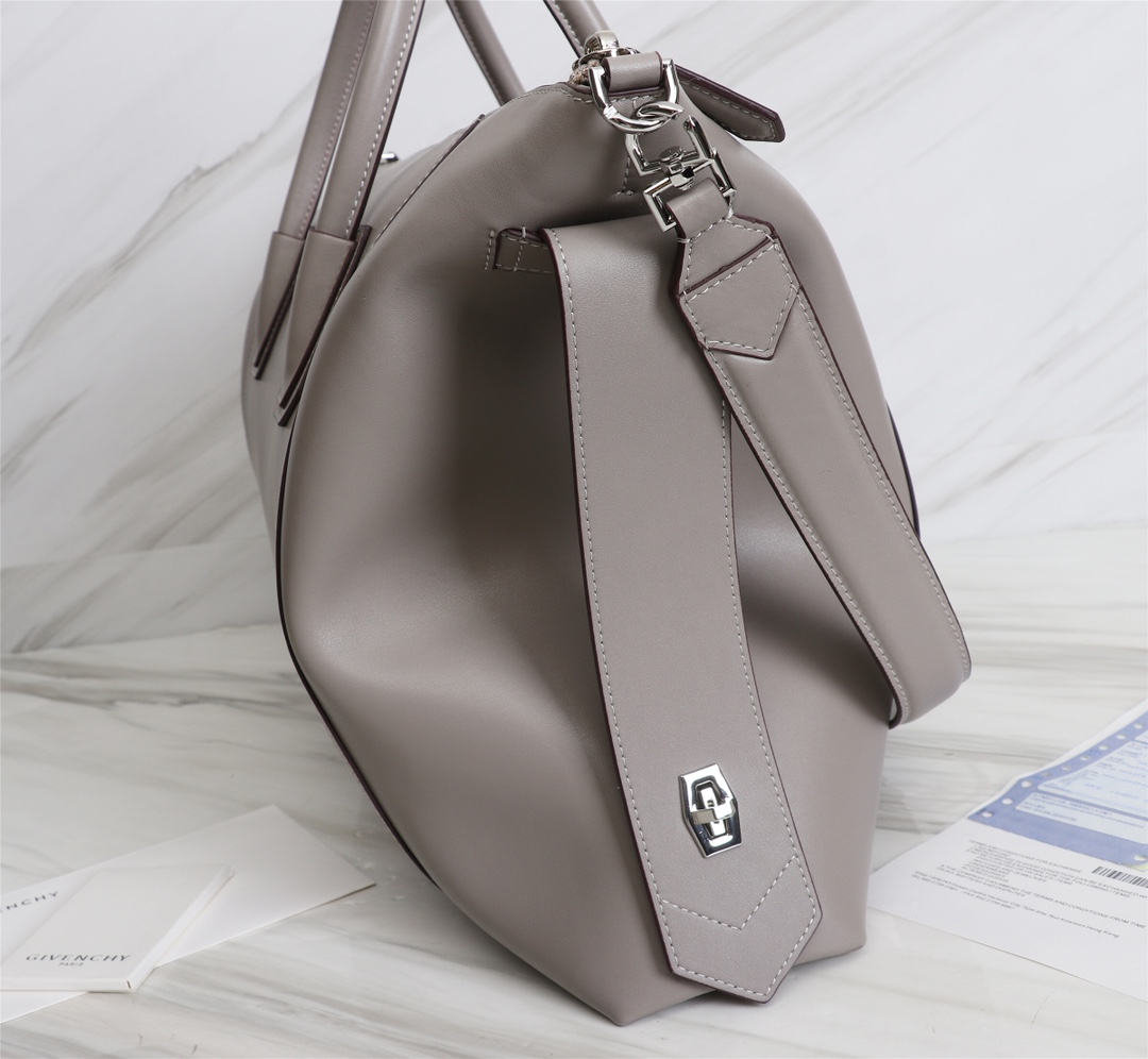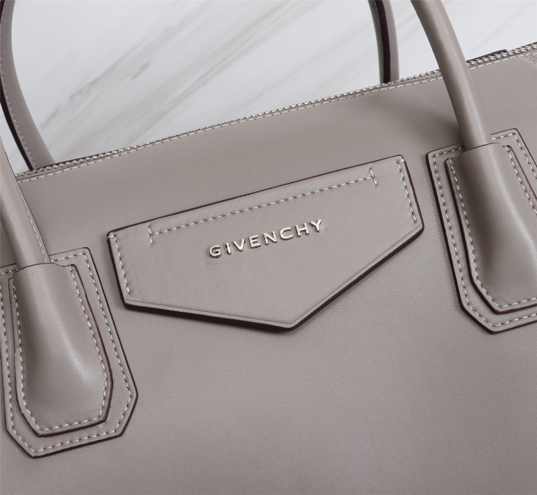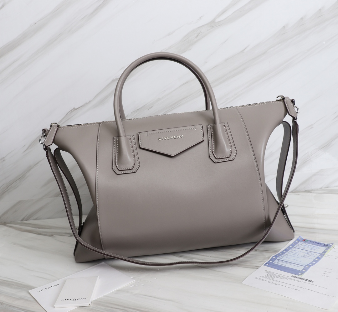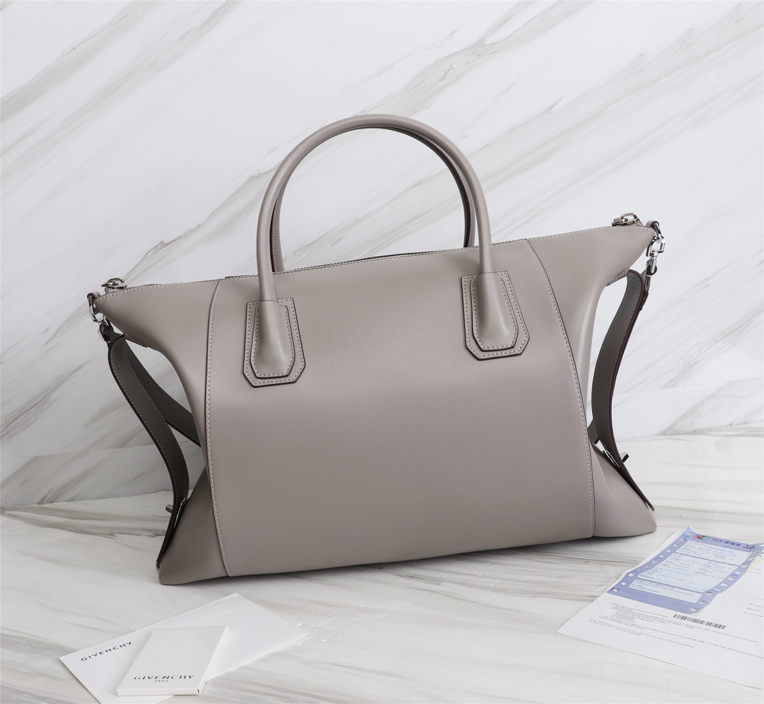 • Medium Antigona Soft bag in cloud grey leather with pentagonal GIVENCHY patch, dark silver-finish metal details and leather side bands with a twist clasp.