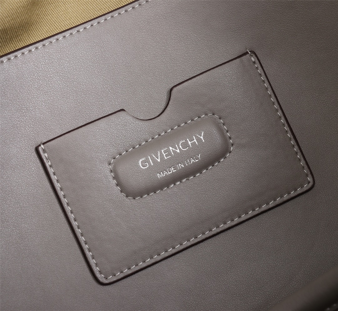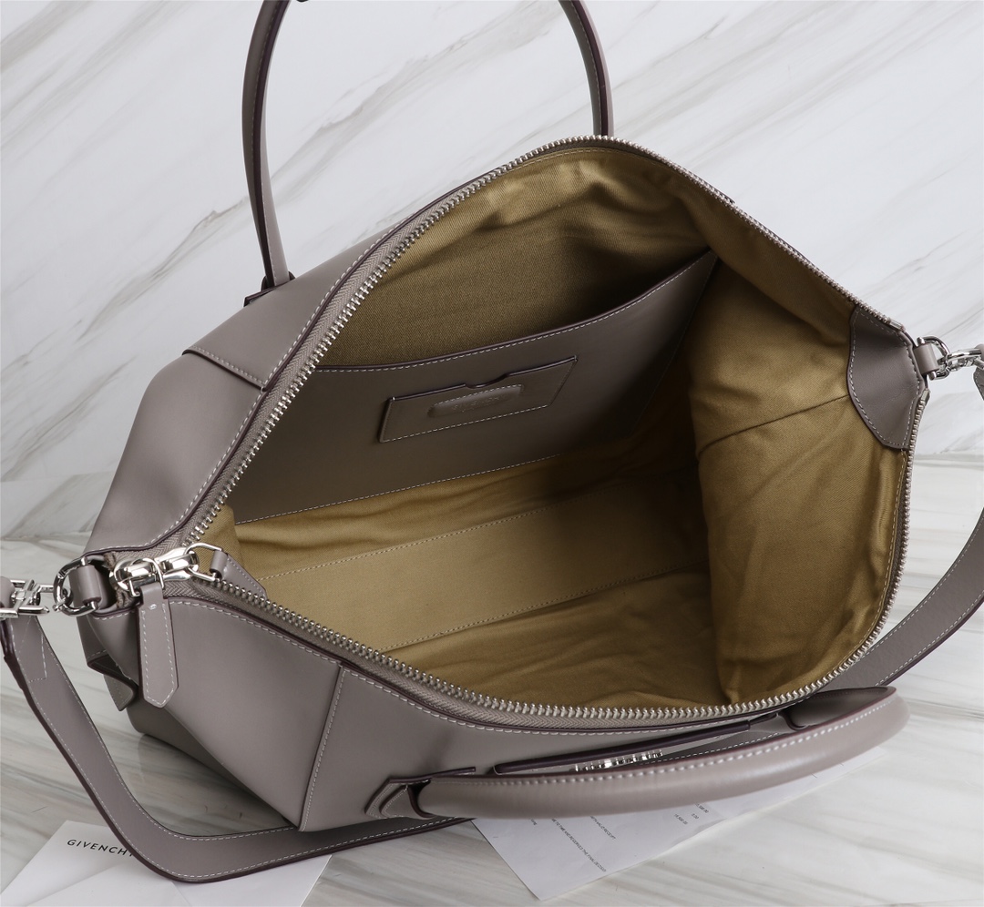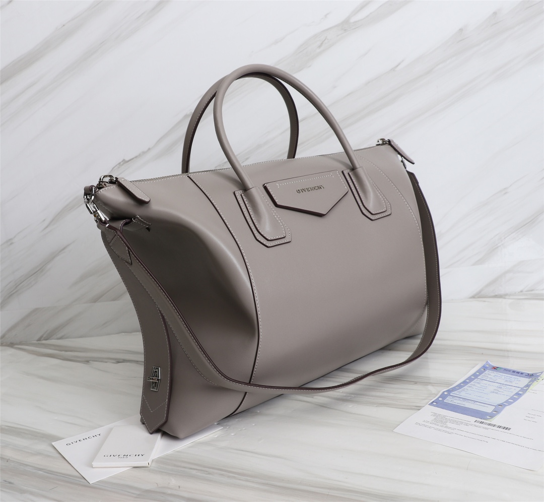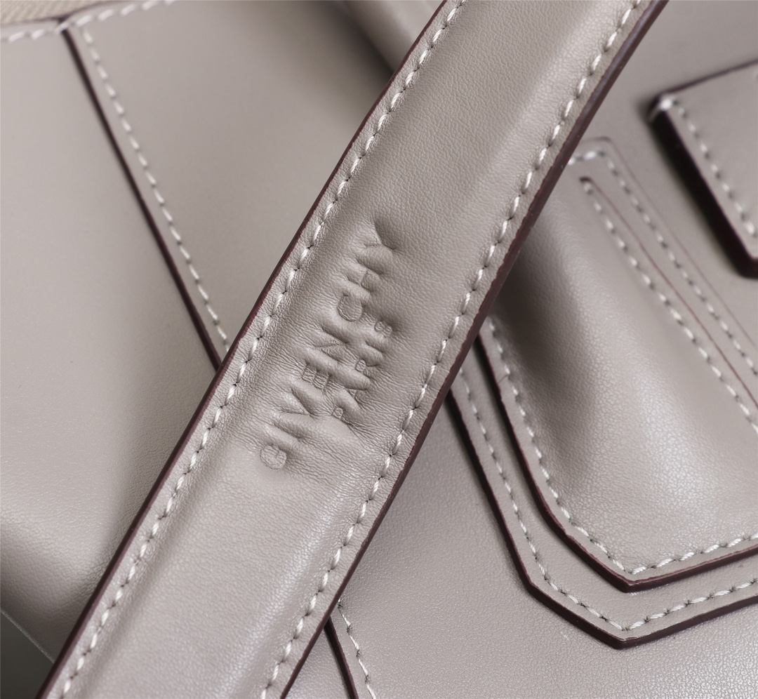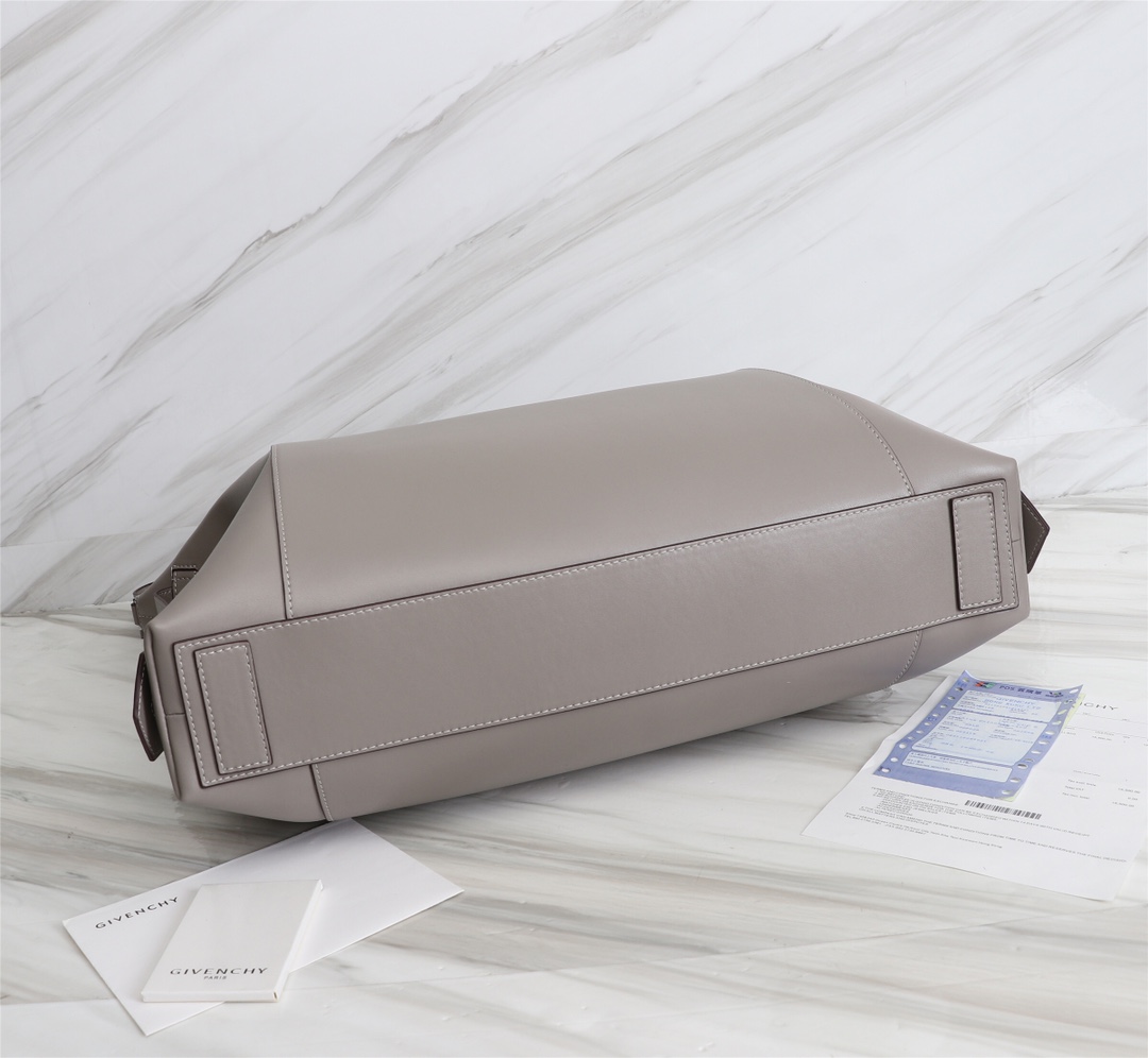 • Medium Antigona Soft bag in cloud grey leather with pentagonal GIVENCHY patch, dark silver-finish metal details and leather side bands with a twist clasp.