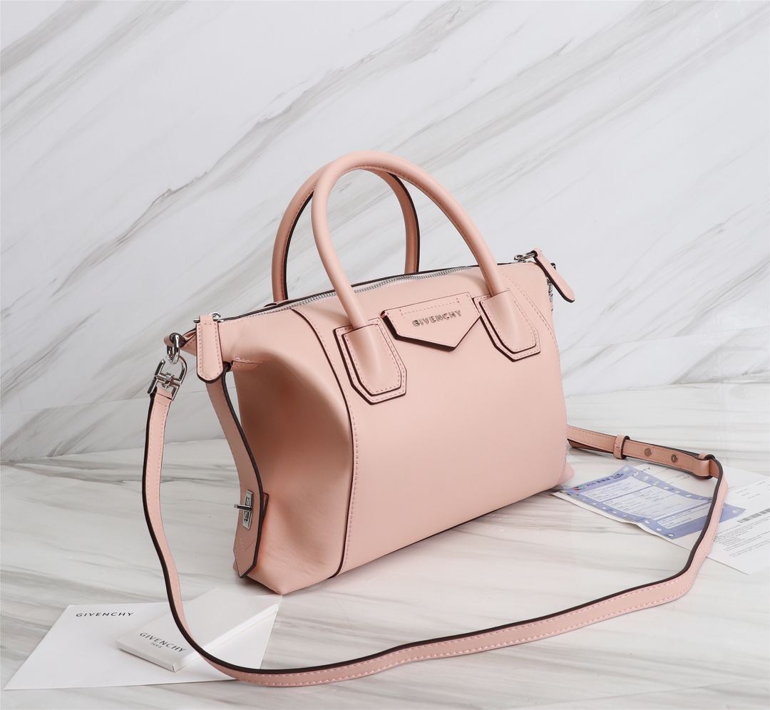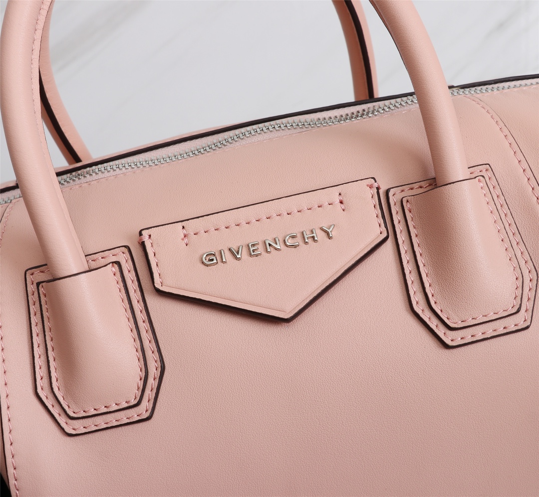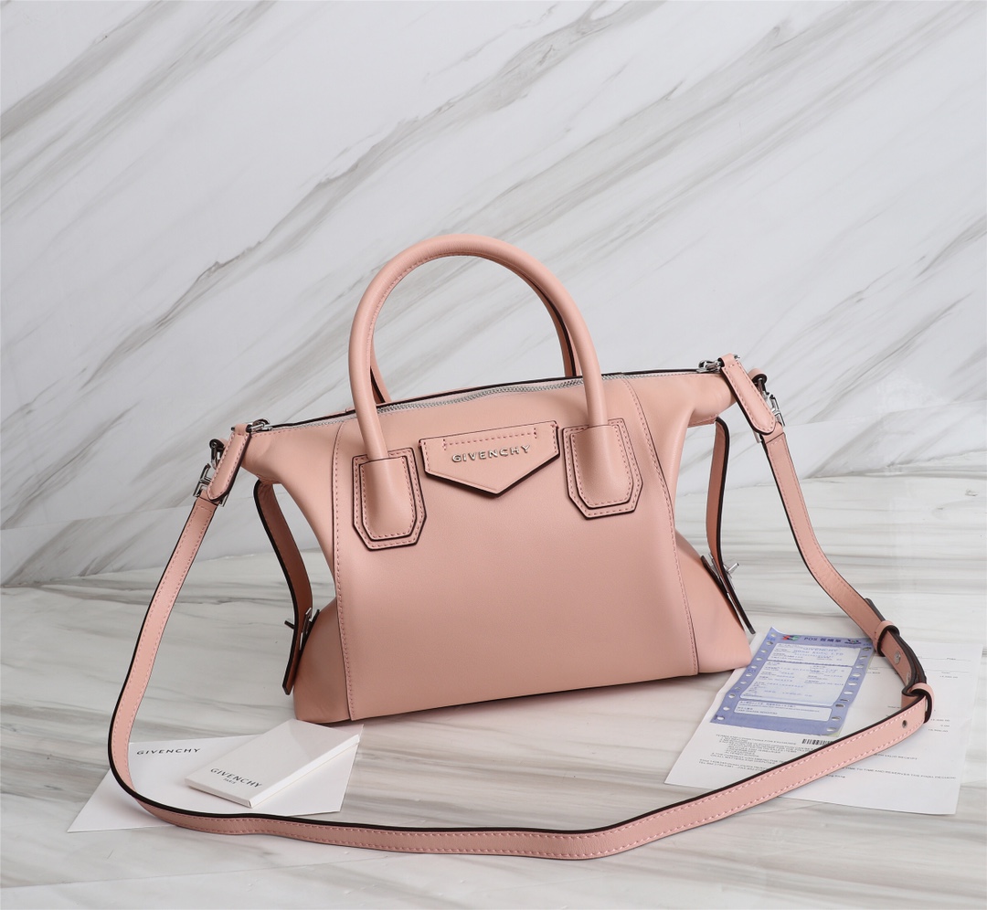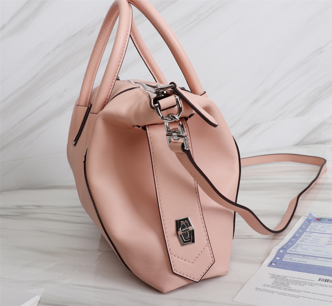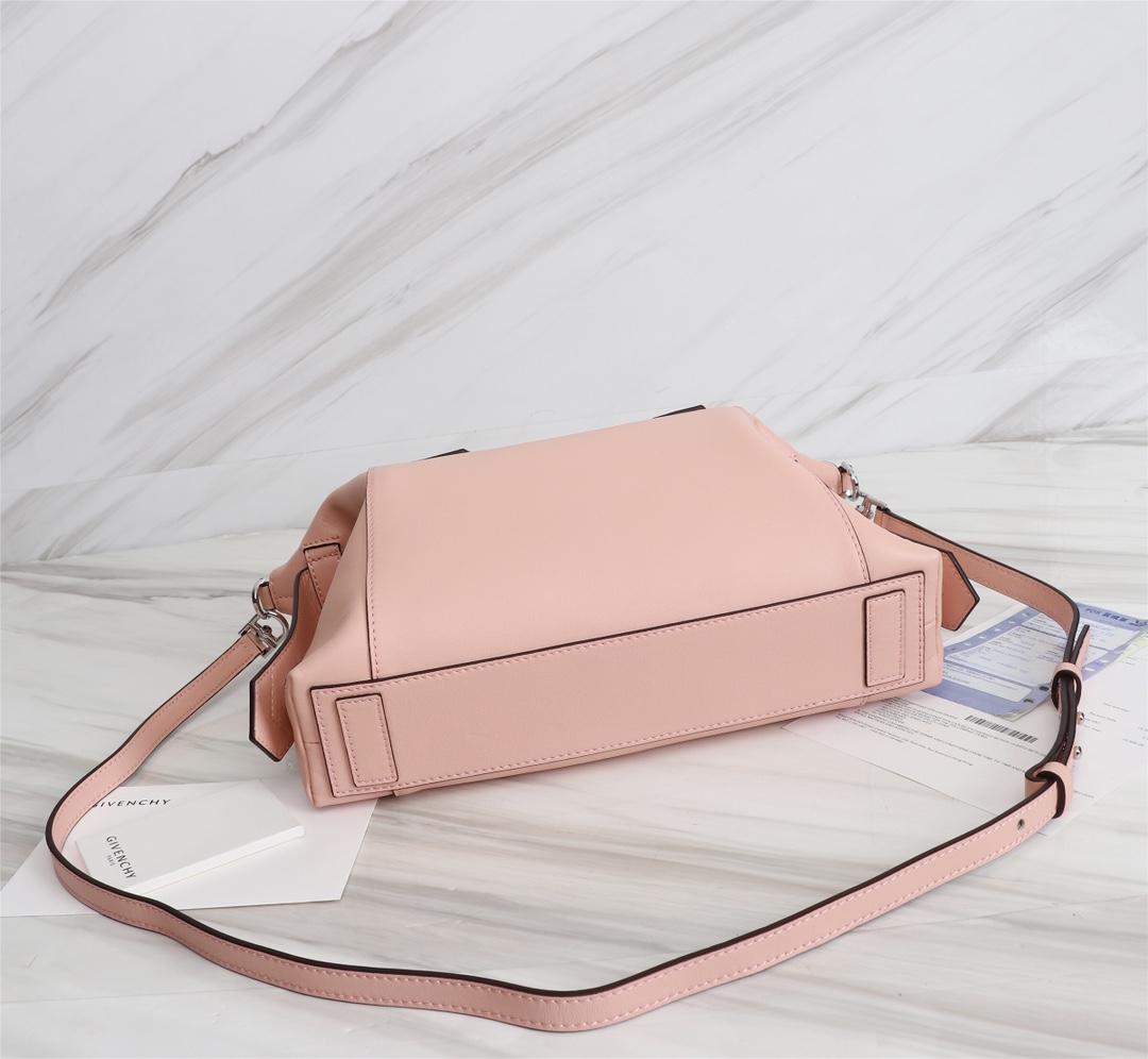 • Small Antigona Soft bag in soft blush pink leather with pentagonal GIVENCHY patch, dark silver-finish metal details and leather side bands with a twist clasp.