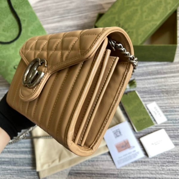 The Gucci Aria collection is an exploration of the House’s most emblematic codes and symbols. The GG Marmont is synonymous with its matelass?? leather and monogram hardware. Here, the mini shoulder bag is reimagined with a new geometric take on its signature finish that combines vertical and diagonal motifs in Light pink.