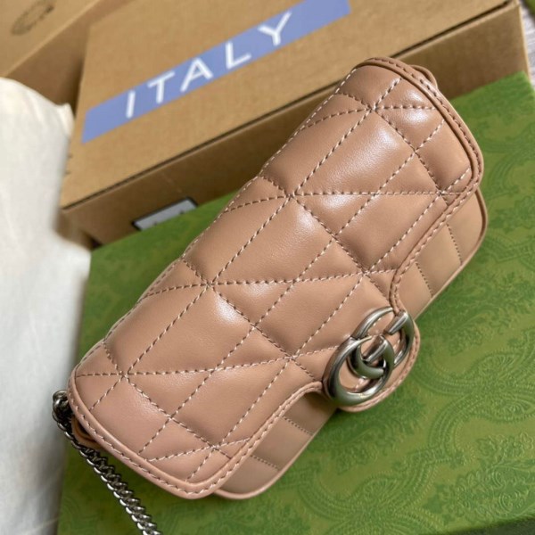 Super mini versions of emblematic accessories channel the House’s whimsical narrative. Synonymous with its monogram hardware and matelass?? finish, this shoulder bag plays with the GG Marmont’s signature elements with a new take on the recognizable quilted design that mixes diagonal and vertical motifs. Appearing since the ’70s, the Double G is showcased in an antique silver tone against grey leather.