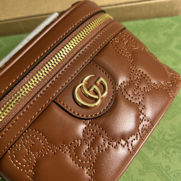 Matelass?? leather is a signature material of the House, thanks to its super soft finish. The textured geometric motif defines a selection of small leather accessories, including this green top handle mini bag. The Double G hardware decorates the front, continuing the logo feel of the design.