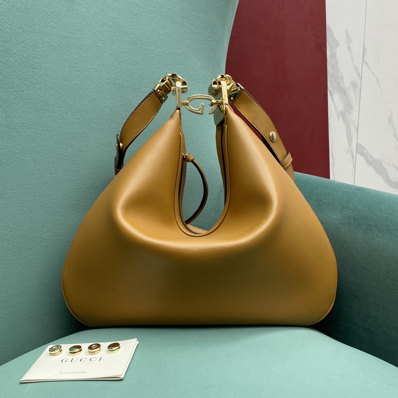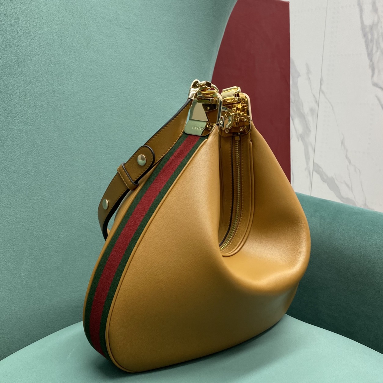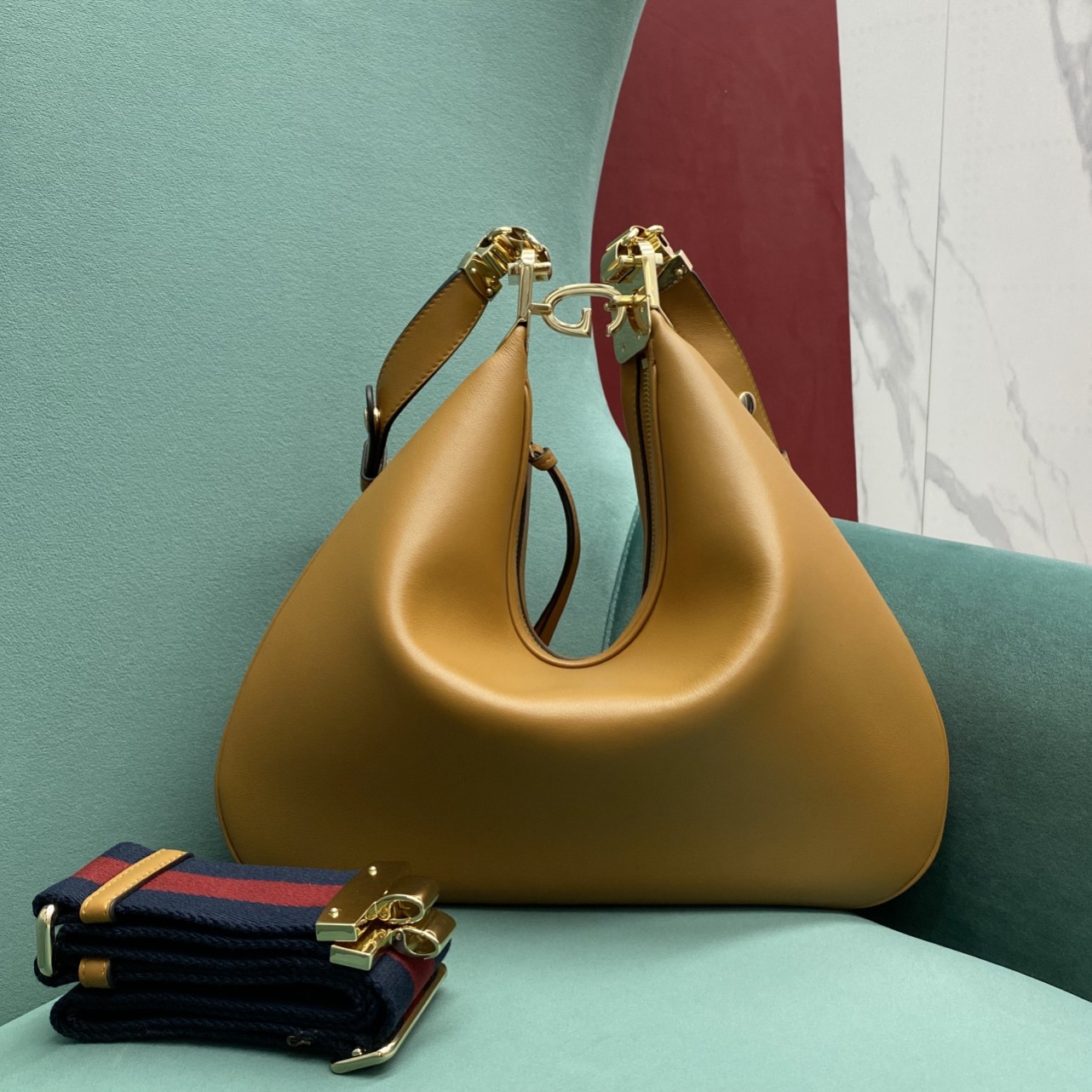 • An ode to the timeless Hollywood glamour that shaped Gucci Love Parade, classic elements from the House’s archives are reintroduced. Distinguished by its crescent moon shape, the accessory is further defined by a G shaped hook closure. Paired with soft materials, the heritage hardware creates a refined design with vintage appeal. This large version is crafted in dark orange leather with green and red Web trim.