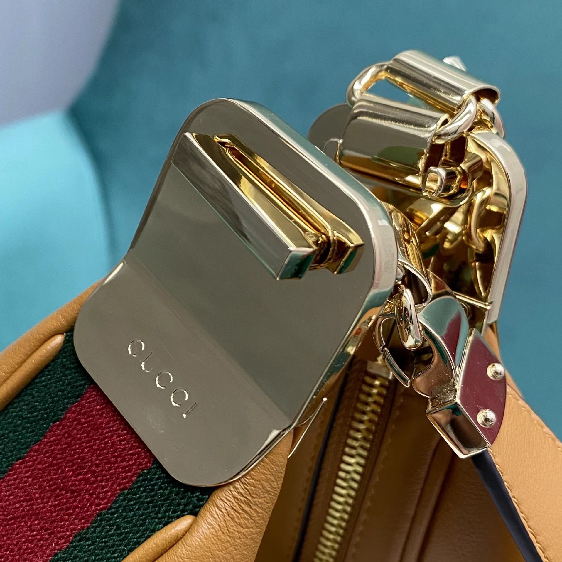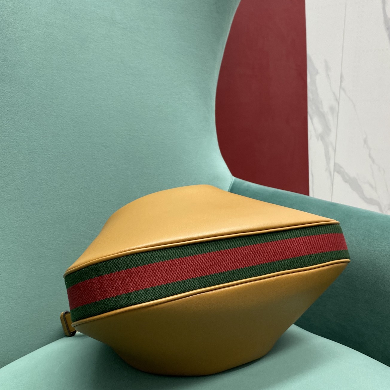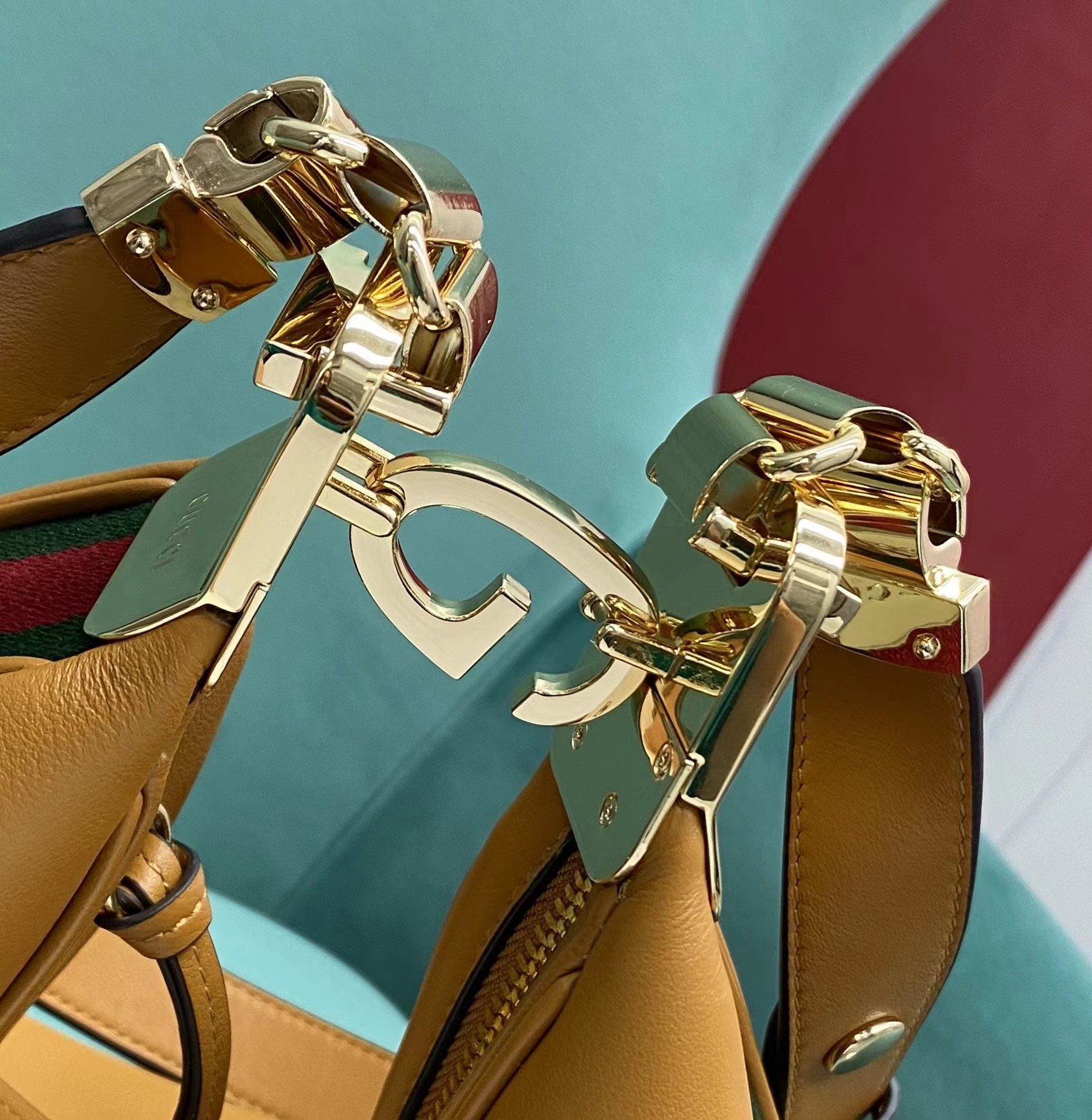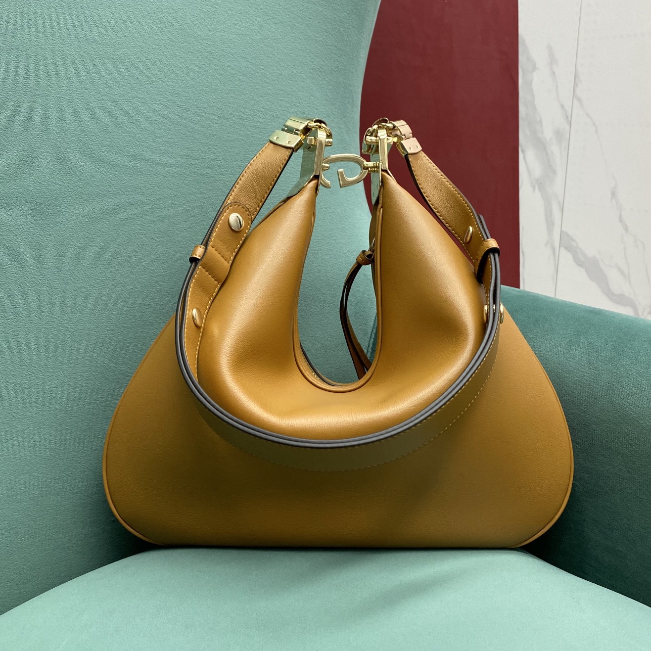 • An ode to the timeless Hollywood glamour that shaped Gucci Love Parade, classic elements from the House’s archives are reintroduced. Distinguished by its crescent moon shape, the accessory is further defined by a G shaped hook closure. Paired with soft materials, the heritage hardware creates a refined design with vintage appeal. This large version is crafted in dark orange leather with green and red Web trim.