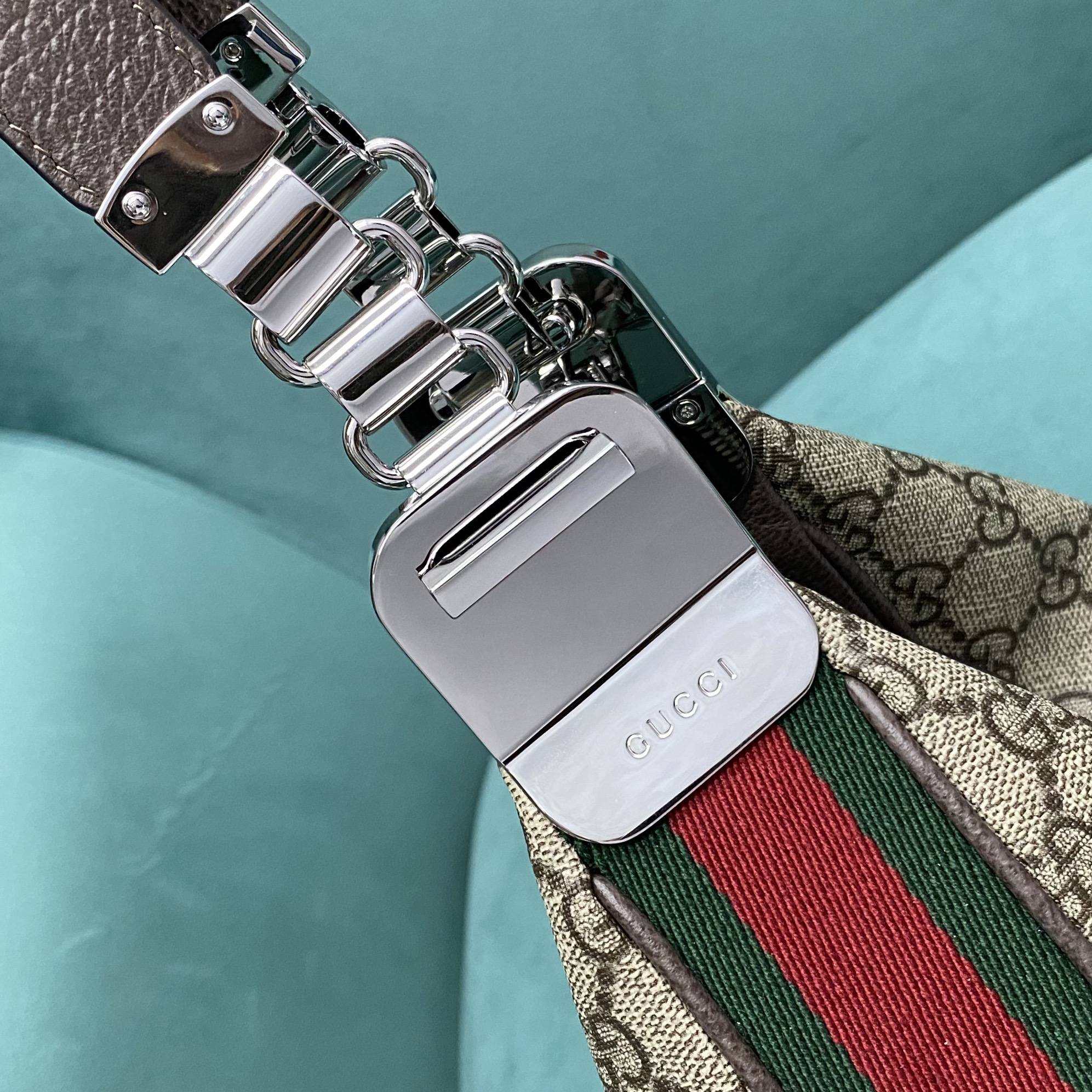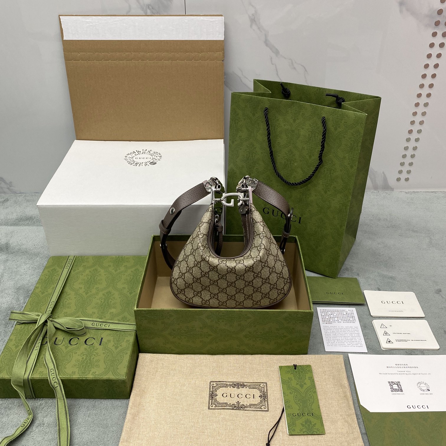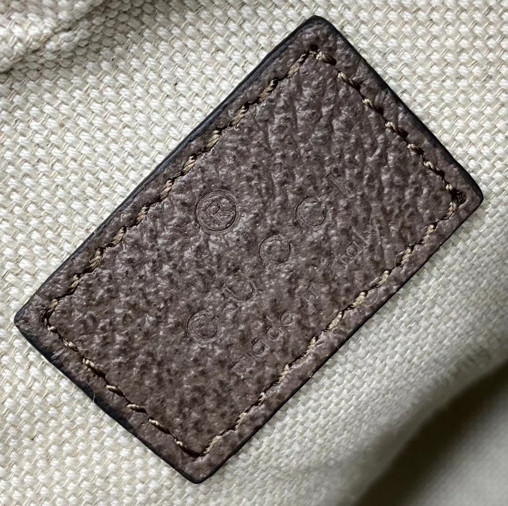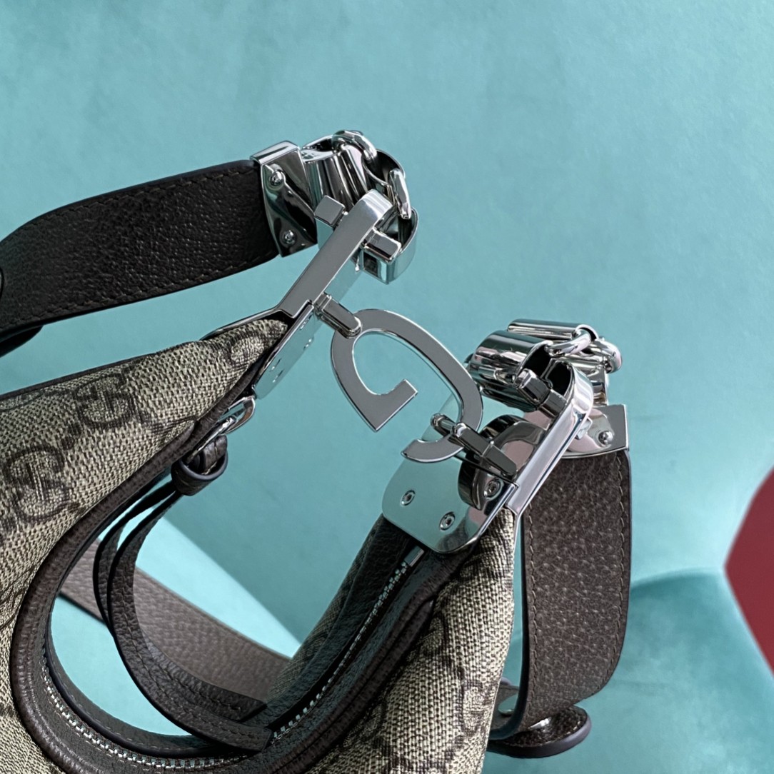 • An ode to the timeless Hollywood glamour that shaped Gucci Love Parade, classic elements from the House’s archives are reintroduced. Distinguished by its crescent moon shape, the accessory is further defined by a G shaped hook closure. Paired with soft materials, the heritage hardware creates a refined design with vintage appeal. This small version is crafted in beige and ebony GG Supreme canvas with brown leather trim.