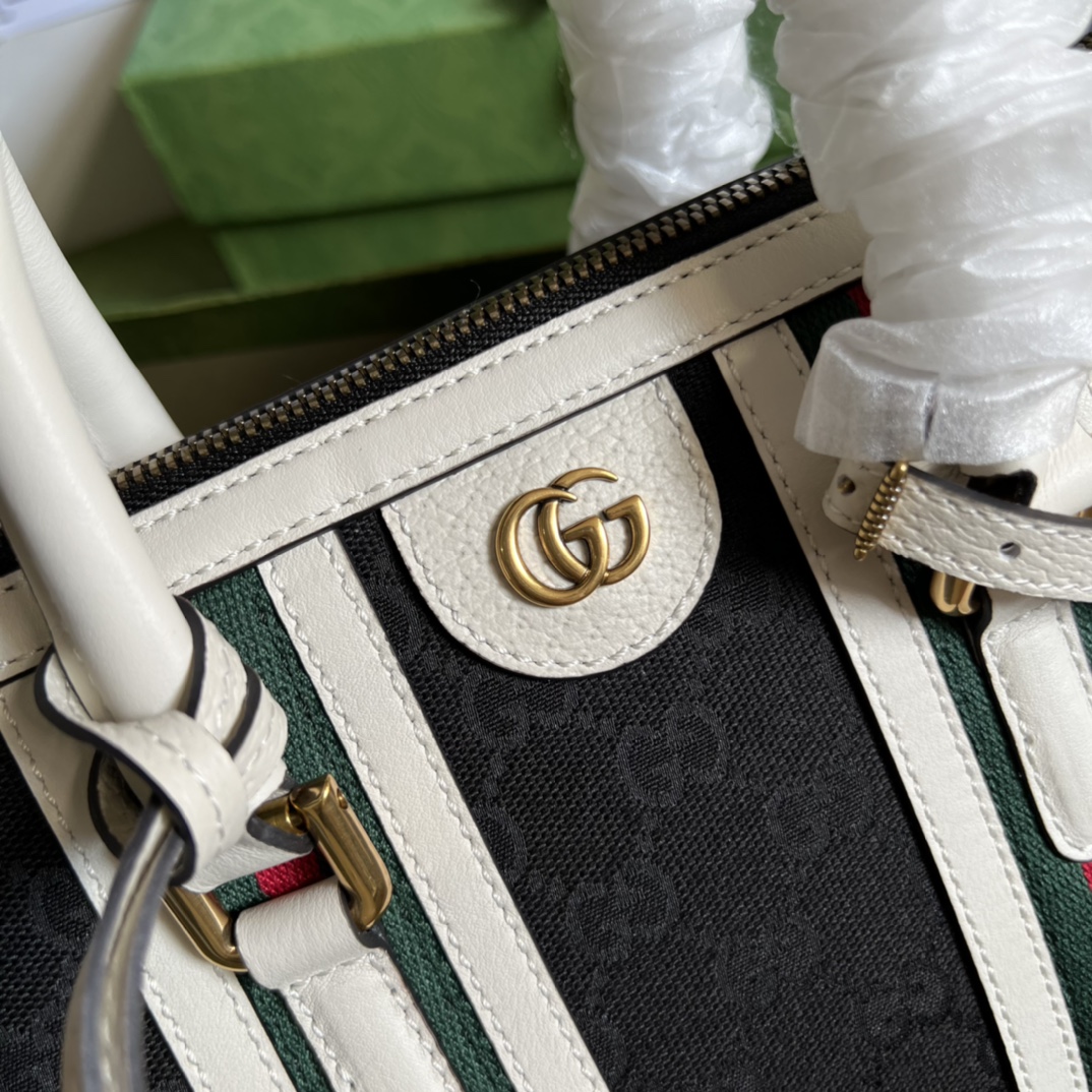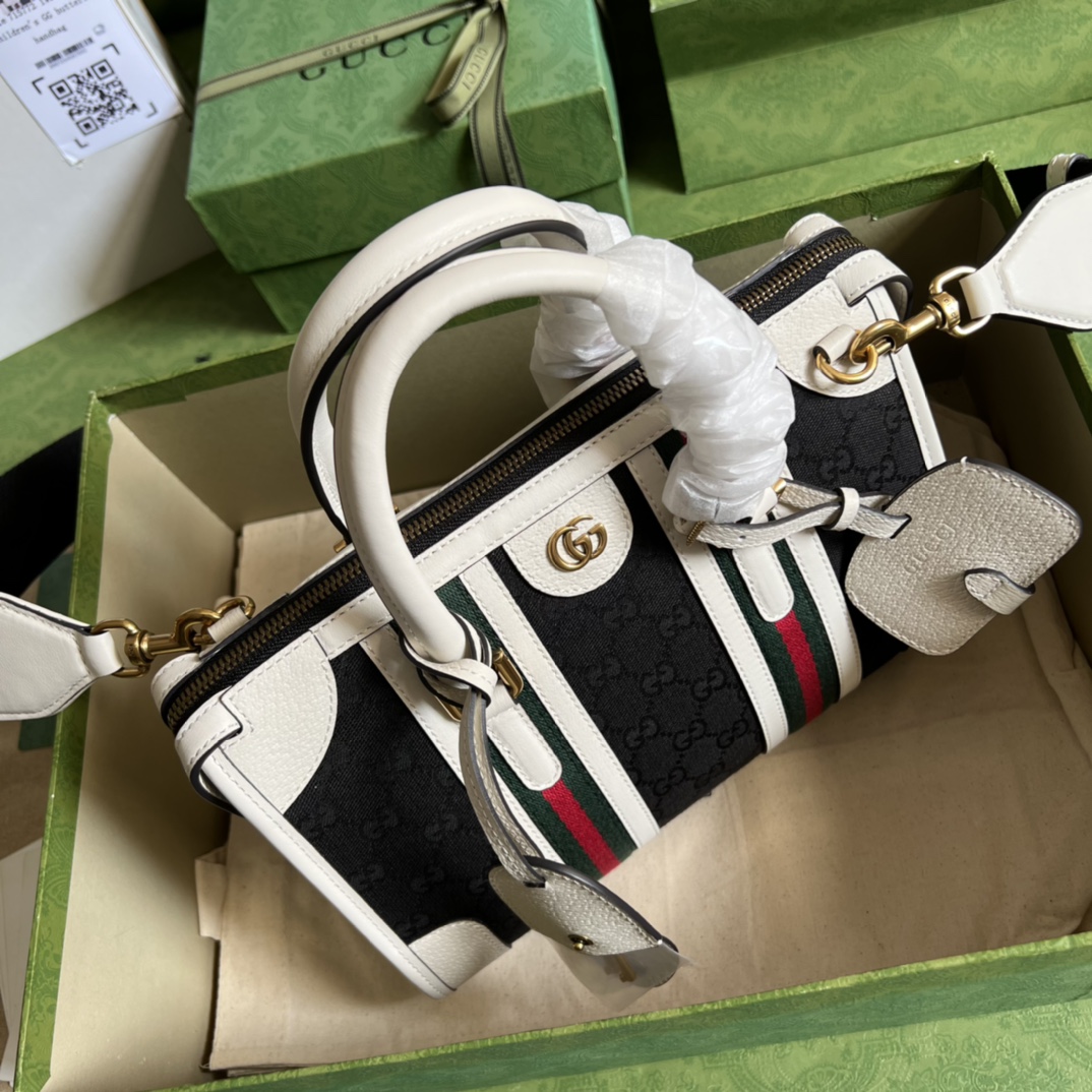 • The top handle bag is reimagined in a new duffle style, part of the House’s latest collection Exquisite Gucci. Crafted in black Original GG canvas, the Web stripe and Double G hardware characterize the silhouette with archival symbols of the House.