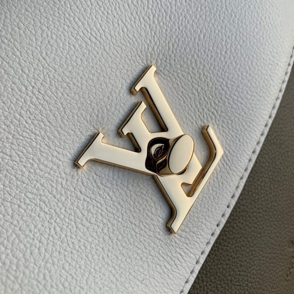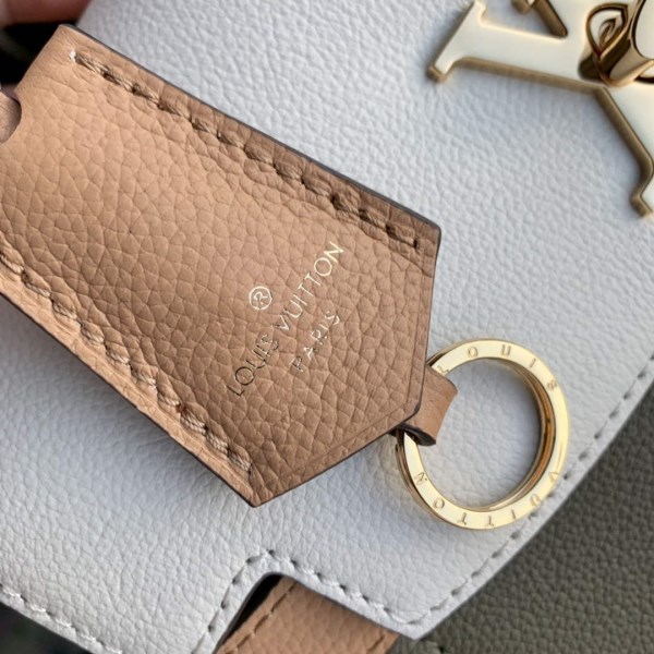 The Lockme Ever BB handbag is crafted from grained calf leather in a new colorway that highlights its striking shape: a light khaki green with quartz white on the flap and warm brown on the strap and handle. Signed with a gold-color LV turn lock, it features a removable leather strap for shoulder and cross-body wear.
