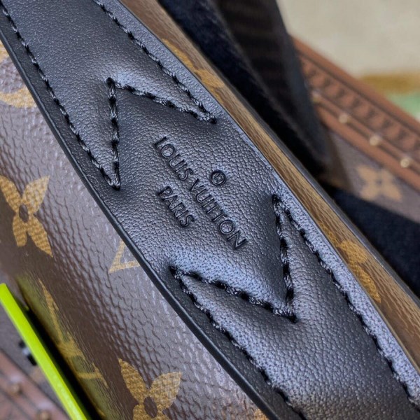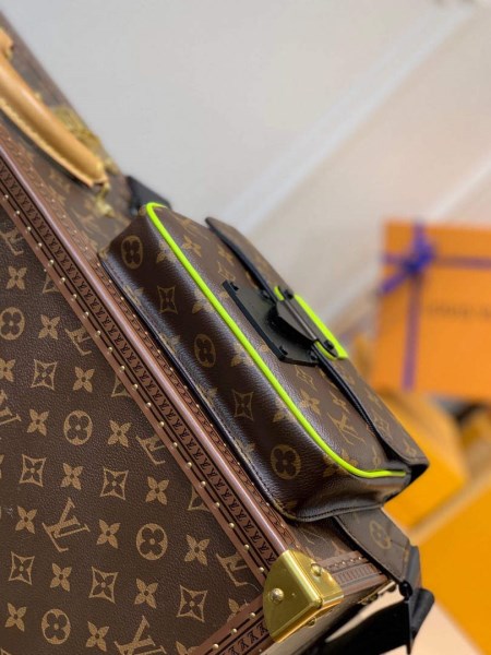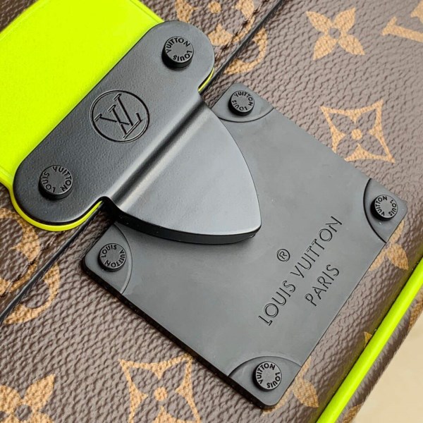 The new S Lock Sling Bag keeps personal items secure with a magnetic closure inspired by Louis Vuitton’s historic trunk clasps. Monogram Macassar canvas is accented by an innovative black metal lock and touches of fluorescent yellow. A sturdy trunk-style leather handle and an adjustable strap, both adorned with the LV signature, offer multiple carry options.