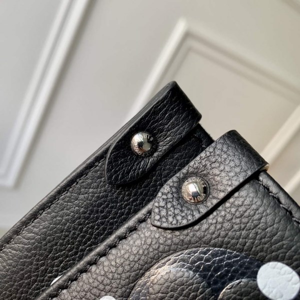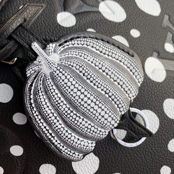 For the major new Louis Vuitton x Yayoi Kusama Collection, the LV x YK OnTheGo MM bag comes decorated with the Japanese artist’s most recognisable signature: repetitive arrays of dots, a symbol of infinity. Dazzling white dots are printed on grained black cowhide embossed with one of the House’s own signatures, the iconic Monogram pattern. This spacious, practical tote comes with a charm shaped like a pumpkin, another recurrent theme in Kusama’s work.