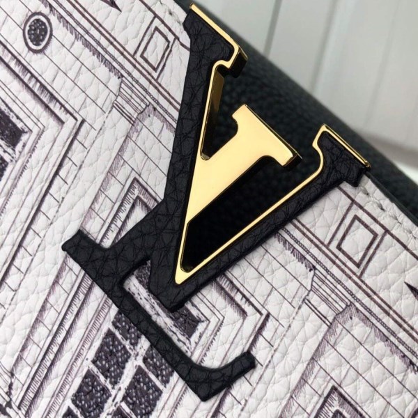 The Capucines BB Architettura is part of the LVxFornasetti collaboration, a capsule created for the Fall-Winter 2021 season. Crafted from calf leather with a matte surface that evokes plaster or stone, this collectible model is printed with Italianate edifices in a classical style, imagined and illustrated in black and white by designer Piero Fornasetti.