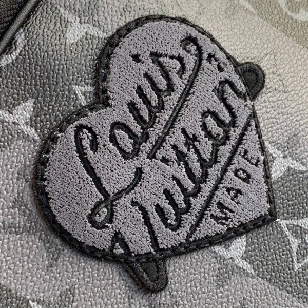 The oversized Modular Sling Bag is fashioned from Monogram Stripes Eclipse canvas, on which the Monogram motif appears on light-and-dark gray stripes, as part of the NIGO x Louis Vuitton capsule collection. It boasts a large main compartment with zip closure and a flat back pocket. It’s signed with a ??Louis Vuitton made?? heart patch.