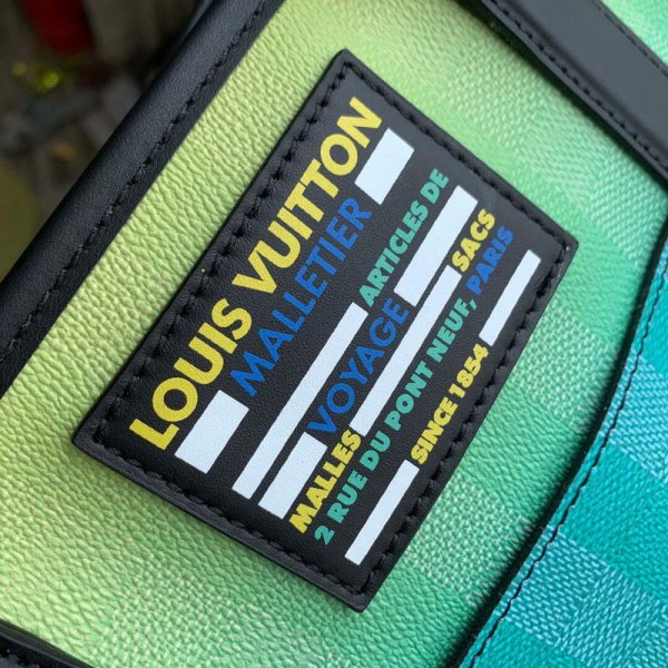 From dark green to almost yellow, the gradient Damier Stripes that decorate this Wkd Tote PM carry-all evoke the colors of an early spring sunset. The black-leather Louis Vuitton label as well as the black trim, handles and removable strap perfectly complement the gradient stripes, emphasizing the bag’s clean lines. Perfect for a weekend getaway.