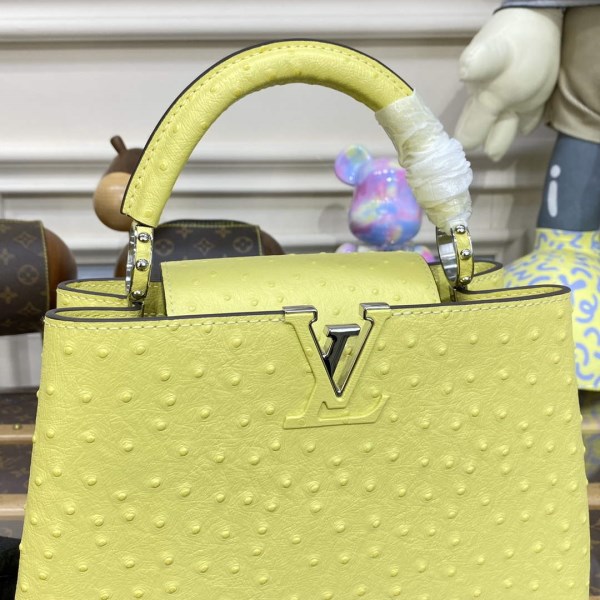 This Capucines BB in precious ostrich leather will elevate any silhouette. Lined with goatskin and fitted with a removable strap for shoulder or cross-body wear, this glamorous bag displays the emblematic design and signature details that make the Capucines a New Classic.