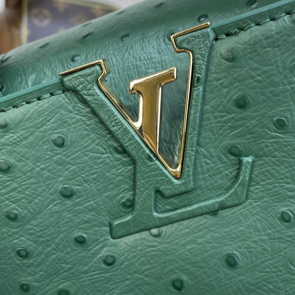 This Capucines Mini in precious ostrich leather will elevate any silhouette. Lined with goatskin and fitted with a removable strap for shoulder or cross-body wear, this glamorous bag displays the emblematic design and signature details that make the Capucines a New Classic.