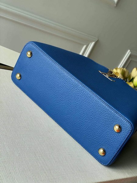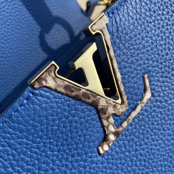 This Capucines BB handbag is made from Taurillon leather and features a wide colorful strap, with Louis Vuitton embroidered on one side and a graphic design of triangles and Monogram Flowers on the other. Named after a mountain range, the Karakoram pattern takes several hours to be embroidered on each strap.