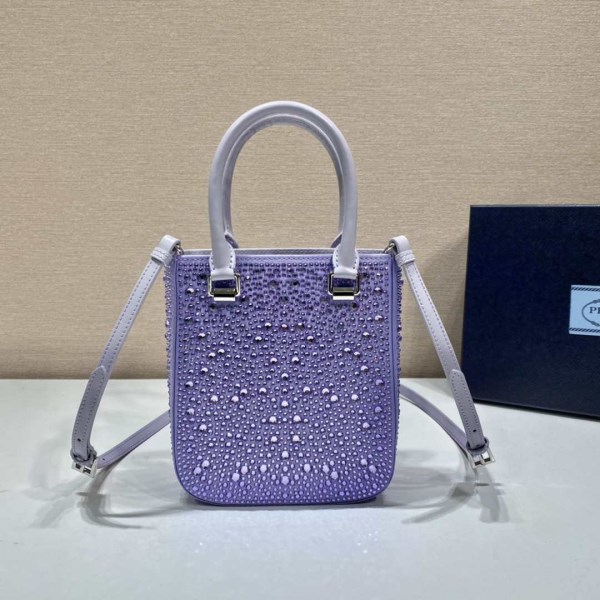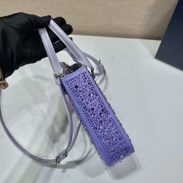 This small square tote with a sleek silhouette and contemporary design comes in a luxurious satin version entirely studded with crystals that create plays of light and iridescent glimmers on the surface. The accessory, complete with a detachable leather shoulder strap, can be worn in different ways.