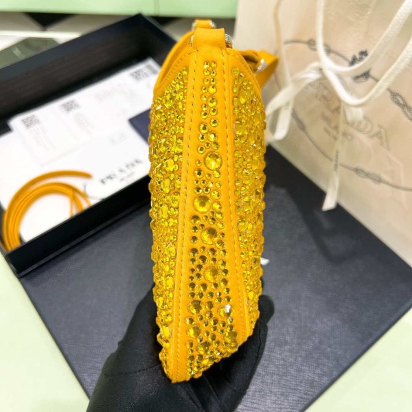 Feminine, elegant and modern, the Prada Cleo bag is made of satin and embellished with luminous crystals of different sizes that give the bag refined charm. The sinuous shape that recalls archive styles makes the accessory iconic.