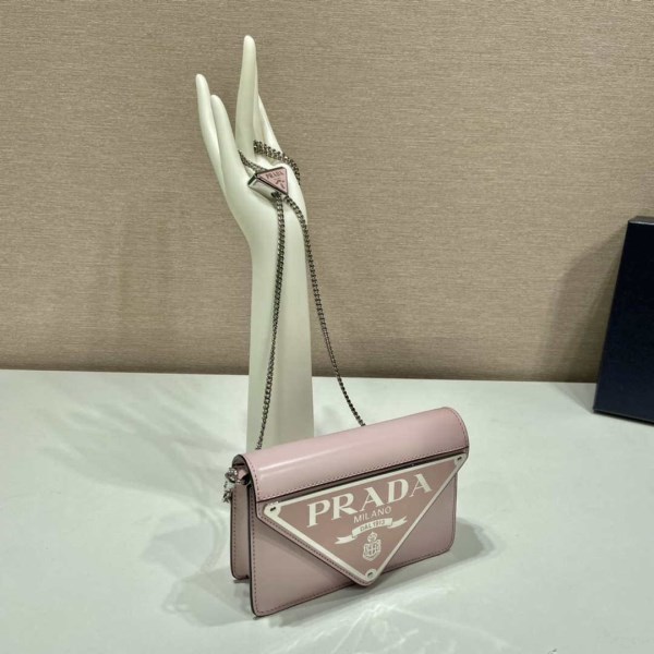 First introduced on the trunks designed by Mario Prada, the triangle is reinterpreted collection after collection through different stylistic codes that inspire new geometric shapes and take on conceptual meanings. This sleek shoulder bag is decorated with the enameled metal maxi logo that gives the accessory an iconic, modern tone.