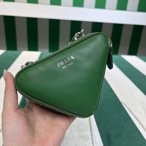 Made from the brand’s hallmark Saffiano fabric, this mini pouch’s silhouette is based off a reinterpretation of the emblematic Prada triangle logo. The style is completed by an iconic, enameled-metal triangle logo, which appeared for the first time on trunks designed by Mario Prada in 1913.