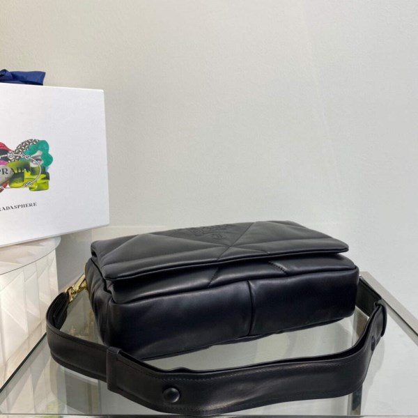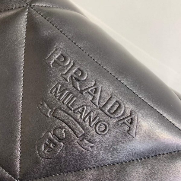 Reinterpreted in always new ways, Prada’s iconic triangle is repeated in the quilted motif of this soft padded nappa leather bag to create a patchwork motif. The chain handle is decorated with the engraved lettering logo.