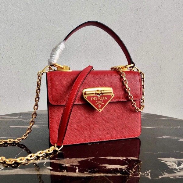 The sleek, formal line of this Saffiano leather handbag is animated with sophisticated details such as the distinctive metal triangle logo on the clasp. The bag has a chain shoulder strap with leather shoulder pad.